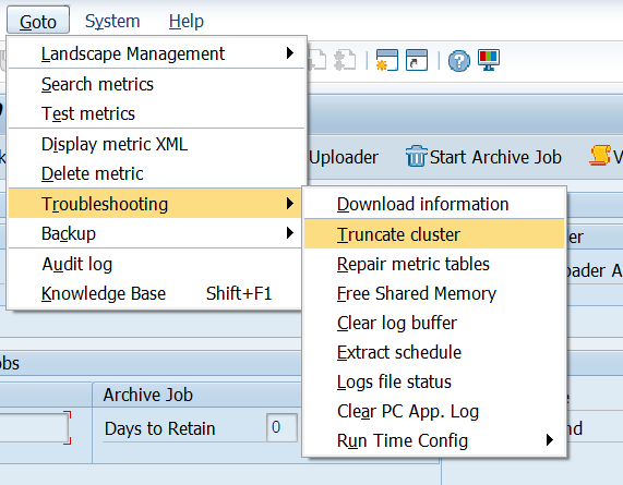 Important: Clean-up all metric tables using the Goto->Troubleshooting->Truncate cluster functionality. More detailed instructions on the Truncate cluster functionality is available using this link: KB 63 - How to remove all collected metrics. This step is mandatory, since the metric serialization approach is changed, and it will cause issues once uploading is started after upgrade: