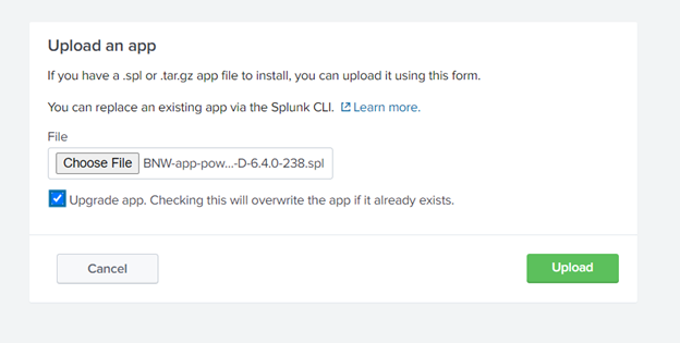 Confirm. Enter credentials if needed. If credentials are required, the Splunk account being used to authorize the upgrade must be an approved downloader of the app. If your organization does not have an approved downloaded, please contact PowerConnect support.