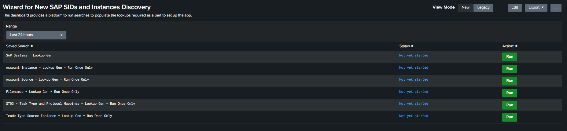 Click the “Run” button for the corresponding searches. “SAP Systems - Lookup Gen” will create a new source lookup to be used throughout the app. The status of the search will be updated in the Status column of the table, and the user can view the search results once the search has completed by clicking “View Results.”