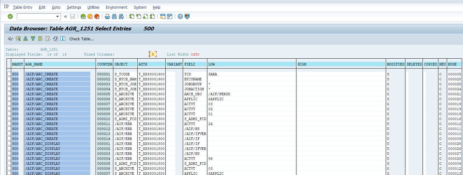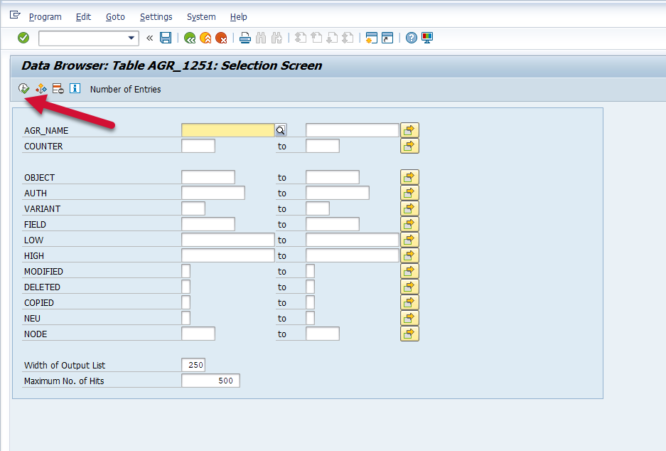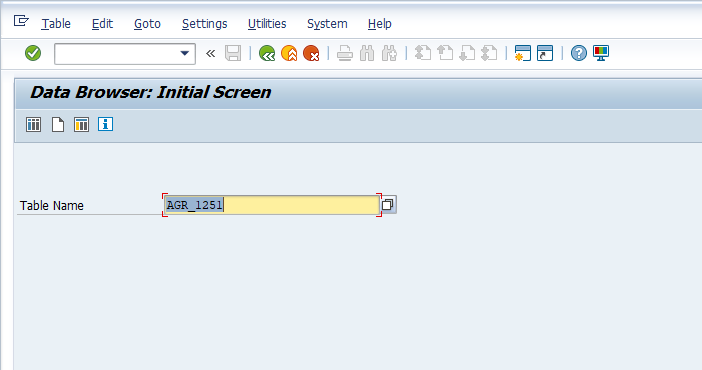 Navigate to this data by using the SE16 t-code and entering the value of AGR_1251 in the Table Name field. Hit the “Enter” key on your keyboard to proceed.