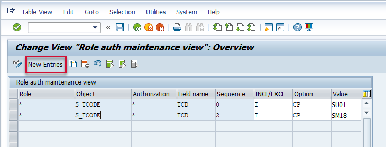 Once in the Role authorizations filter, select the “New Entries” button. Then place the string value for the role and authorization object details that you would like to collect the data for. Please note that wildcards are accepted.