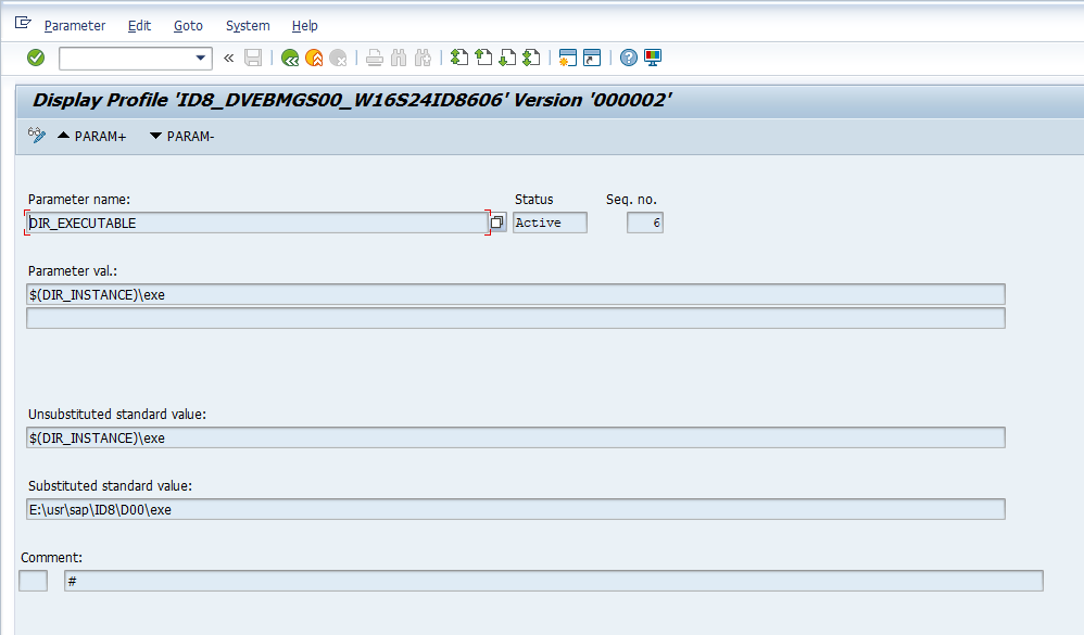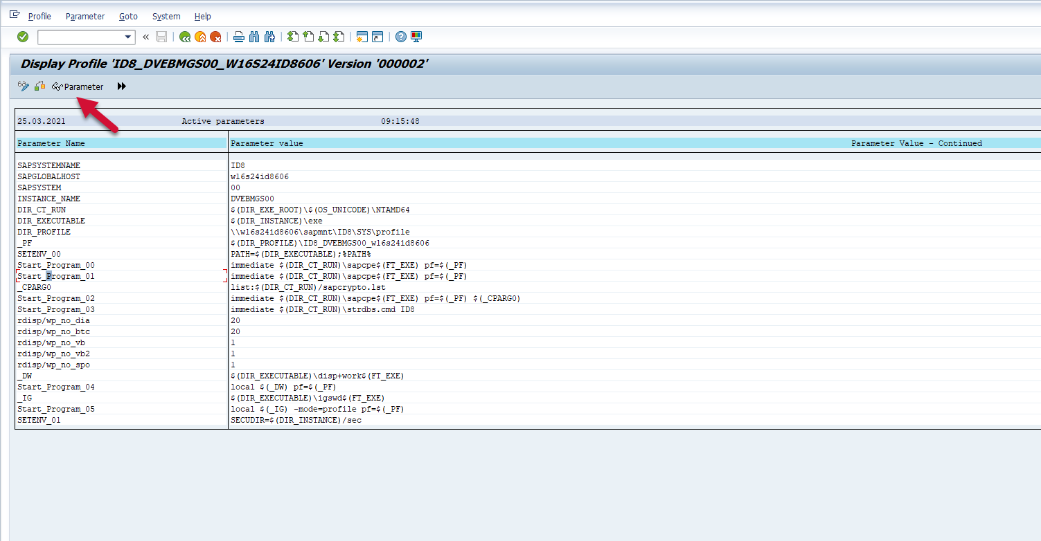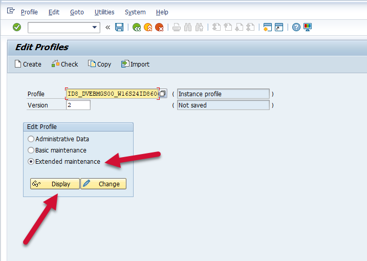 Navigate to this data by using the RZ10 t-code. Enter the desired profile name in the “Profile Name” field, and the profile version in the “Version” field, select Extended Maintenance under the “Edit Profile” option, and select the “Display” button.