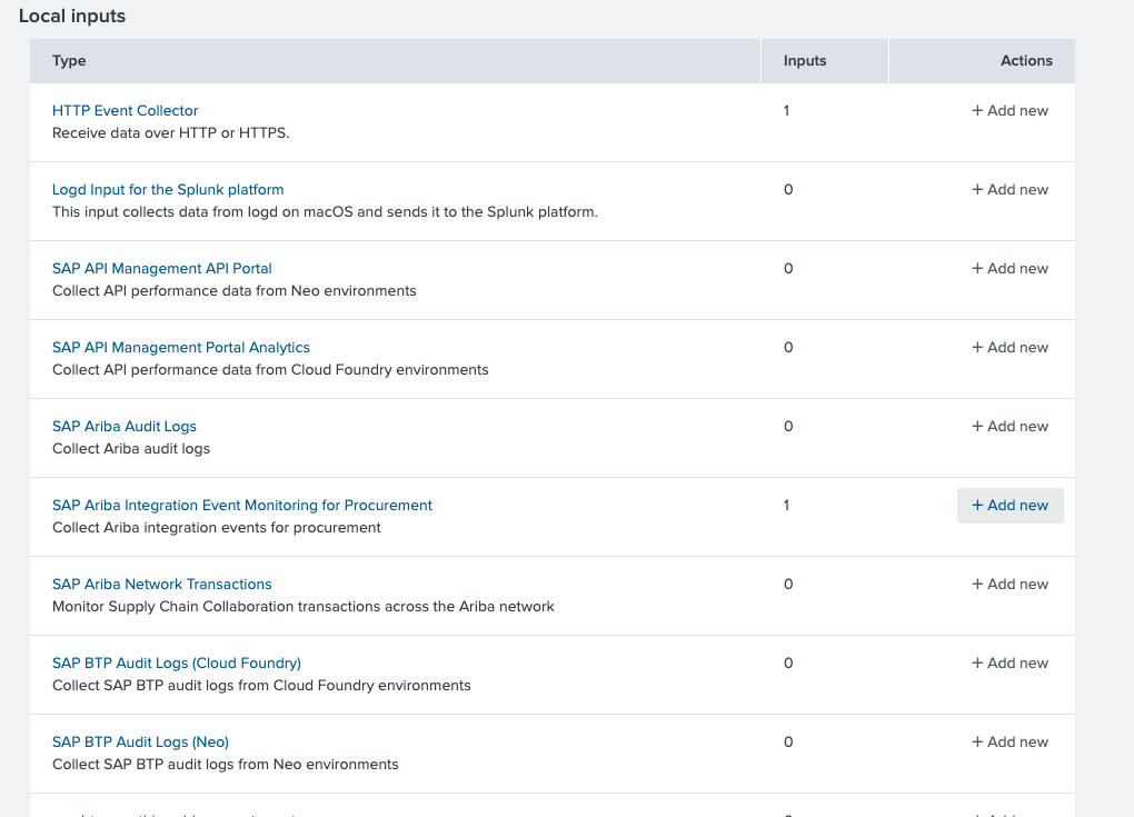In the Local inputs table choose an Ariba Input e.g. SAP Ariba Integration Event Monitoring for Procurement and click + Add new
