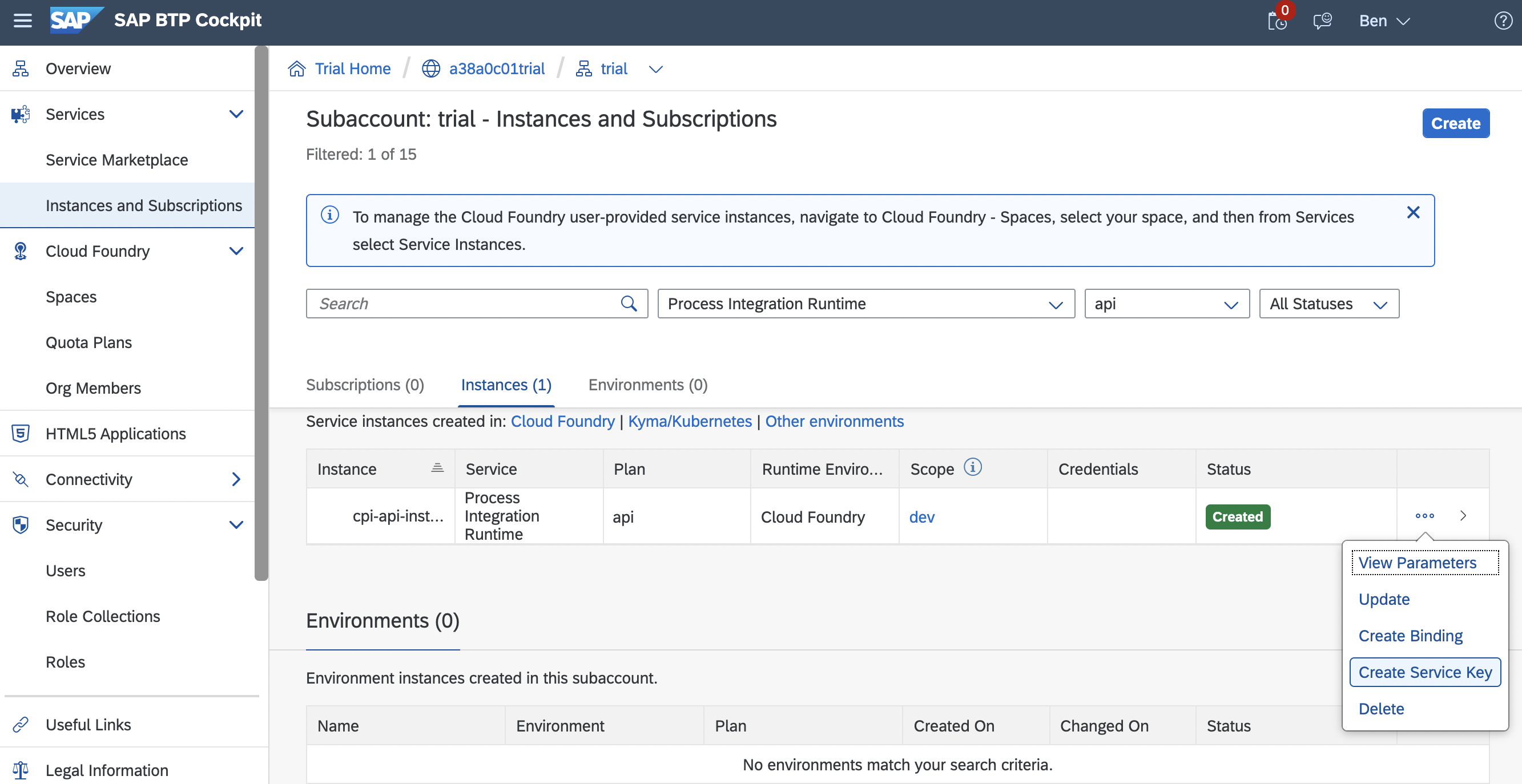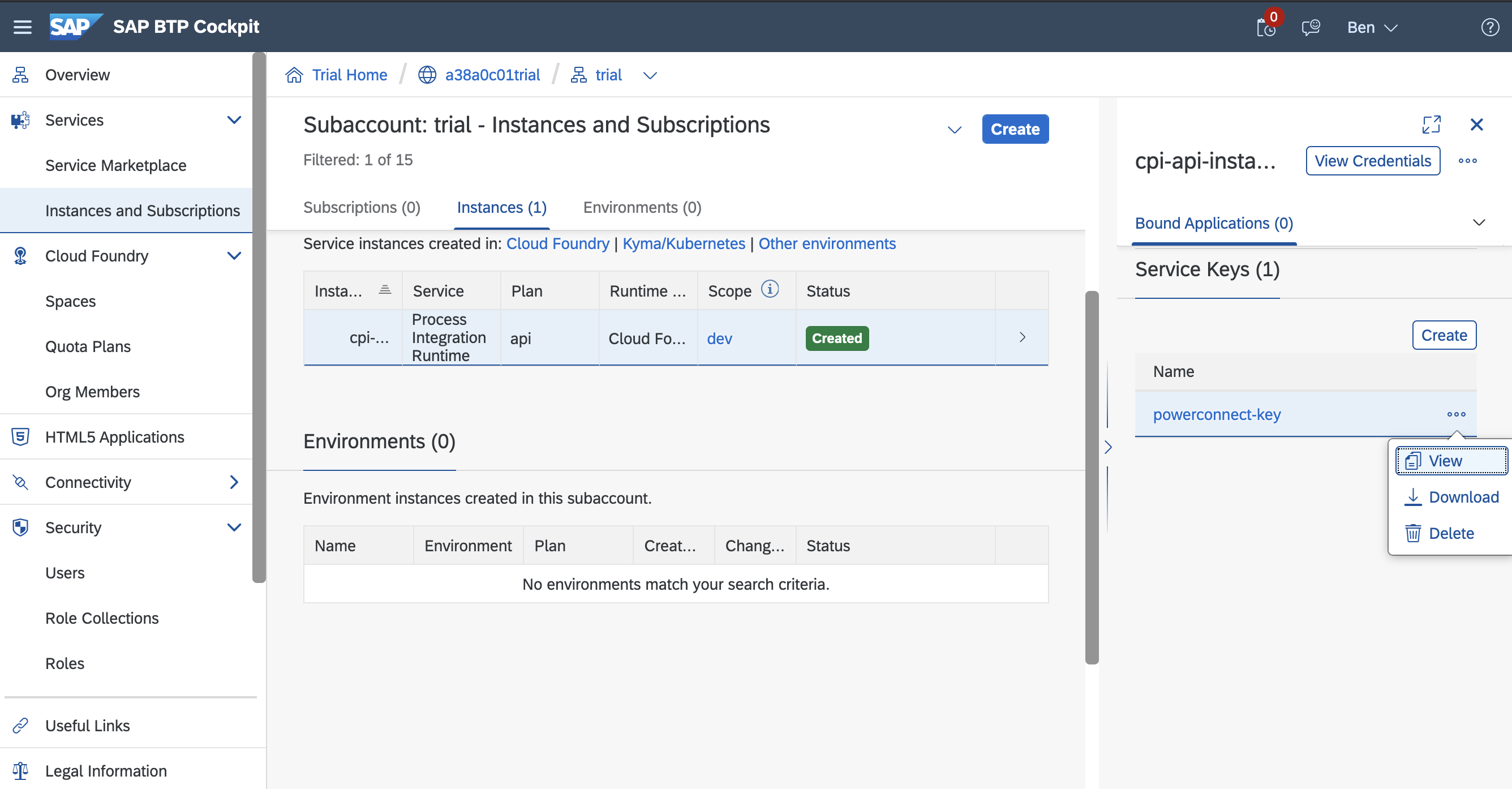 Click Instances and Subscriptions then choose the CPI API Instance again. Under Service Keys you should see the new Service Key you just created.