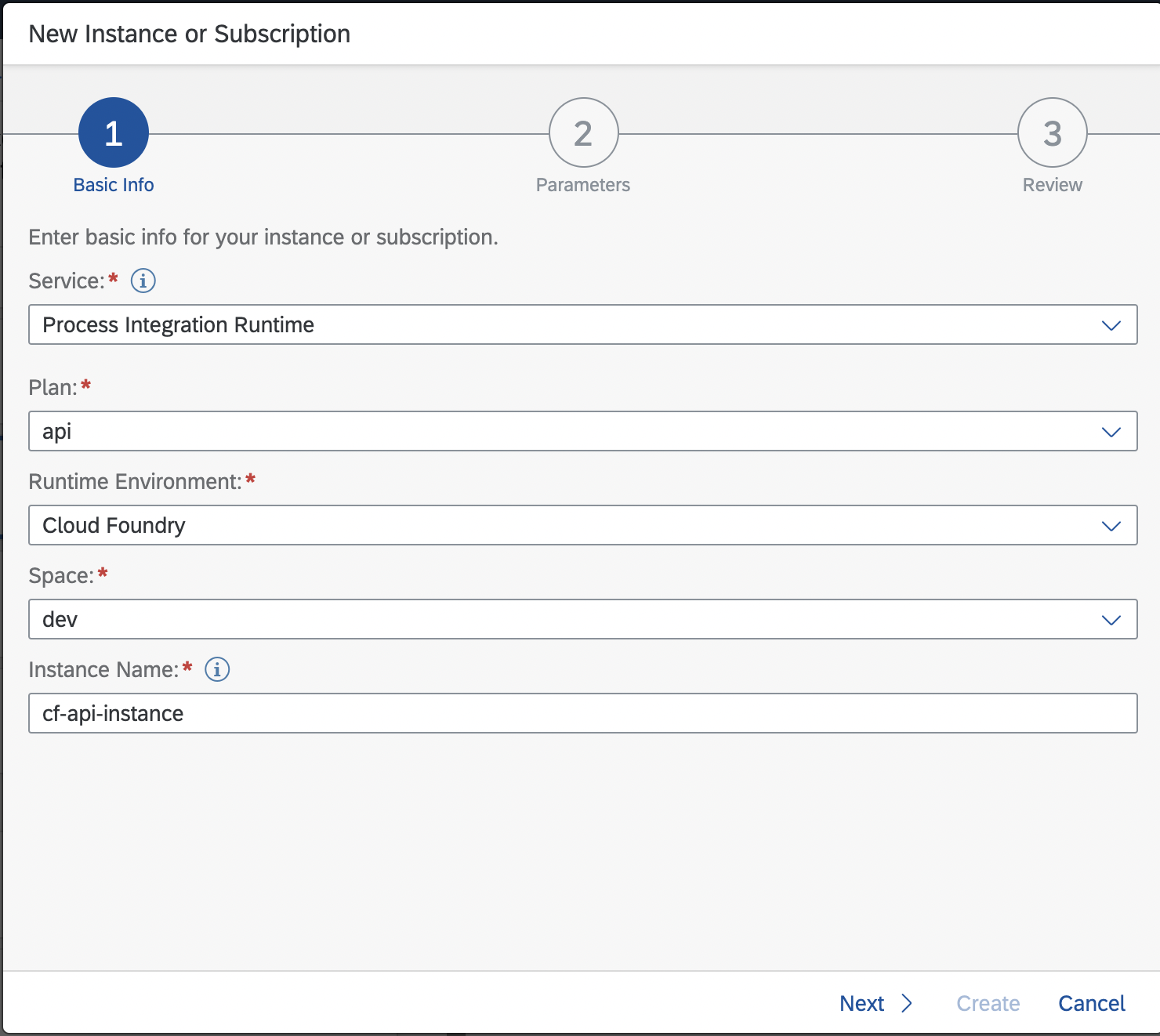 Under the Service Plans for Process Integraion Runtime click the three dots on the api row then click Create:
