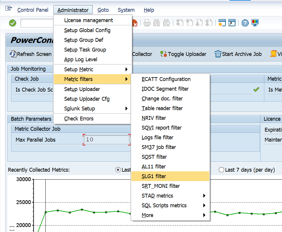 The Metric Filter needs to be defined to extract data for this event. Log into the managed system and execute the /n/bnwvs/main transaction code. Then go to Administrator → Metric filters → SLG1 filter.