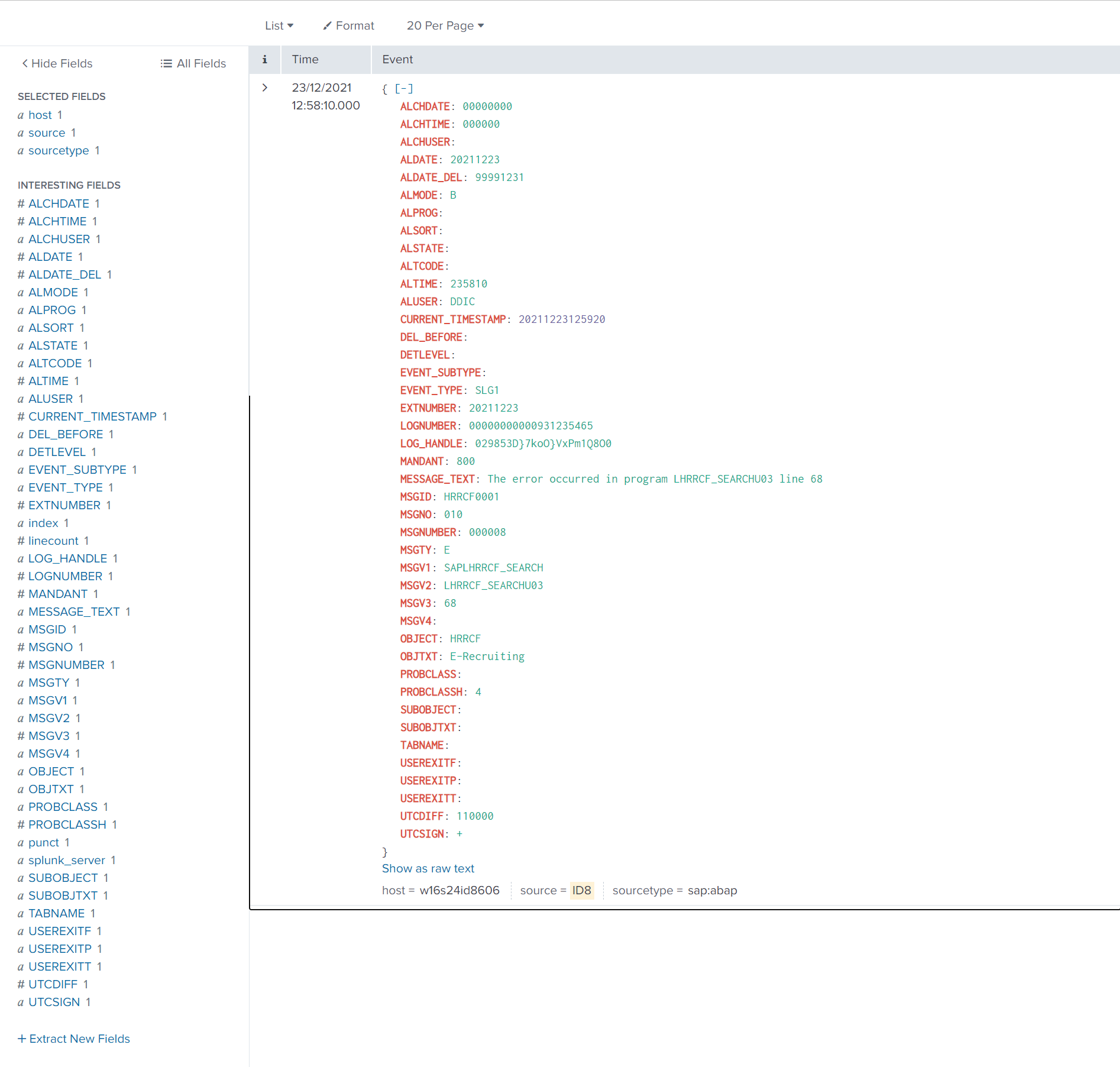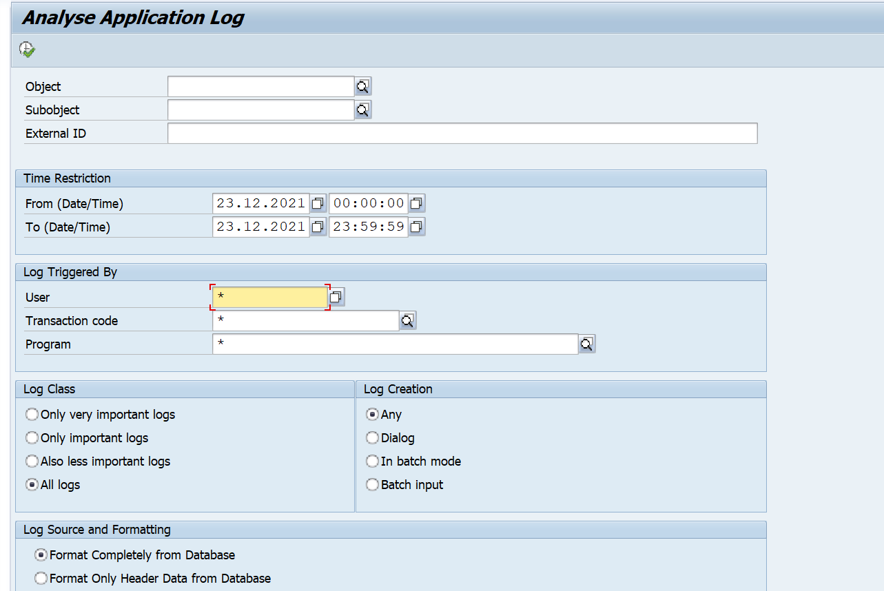 User - This field is the name of the user that caused the log event. If you would like to extract data from all users that caused the log event, place a wildcard value in this field, or specify a specific username from the SLG1 transaction.