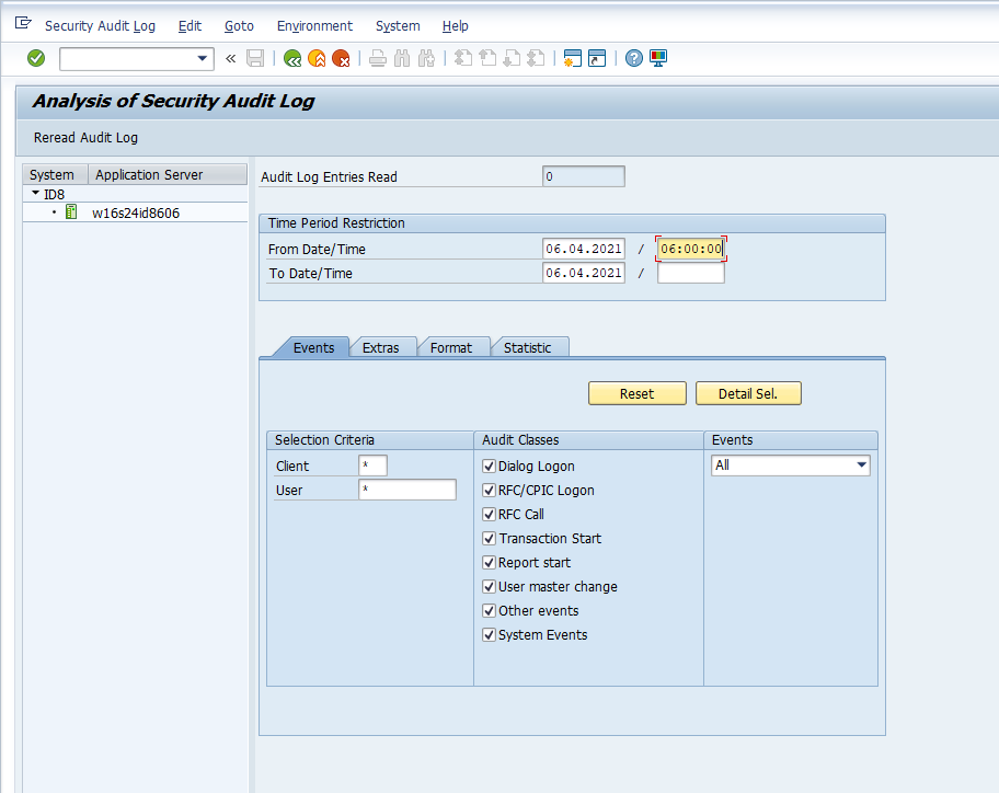Client - This field is mandatory and is used to filter on a specific client of the SAP system that is noted within the security audit log. To extract data from all the clients, enter a wildcard value (i.e. “*”).