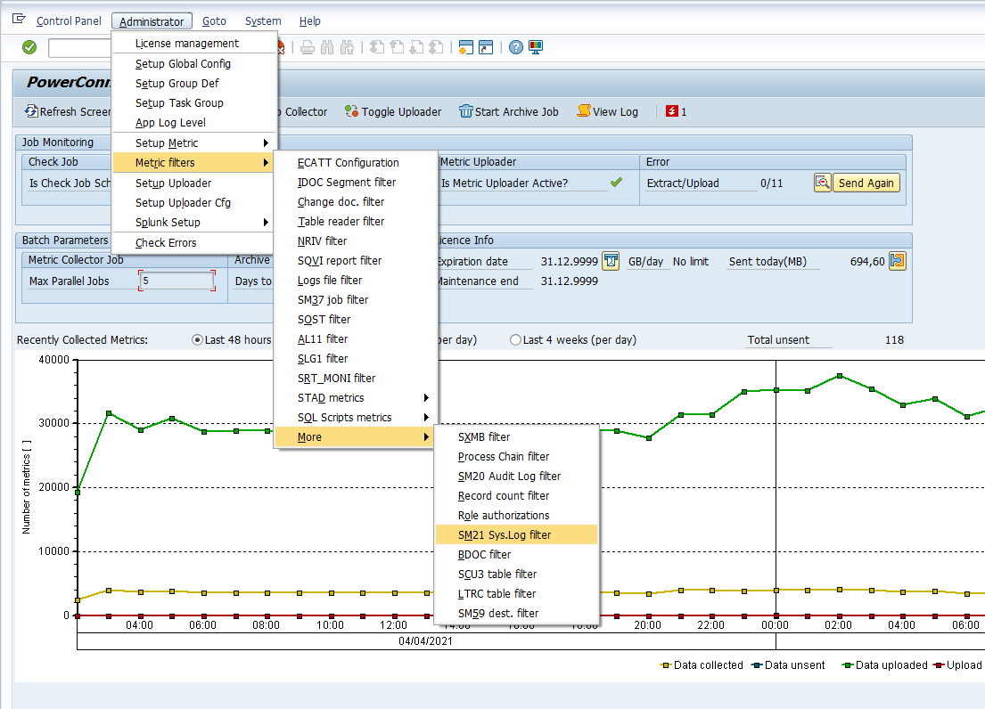 This filter is used to select or exclude specific messages from the system log and is an optional configuration to control data volume sent to Splunk. By default, all system log messages are collected by PowerConnect. To access the filter, log into the managed system and execute the /n/bnwvs/main transaction code. Then go to Administrator → Metric Filters → More → SM21 Sys.Log Filter.