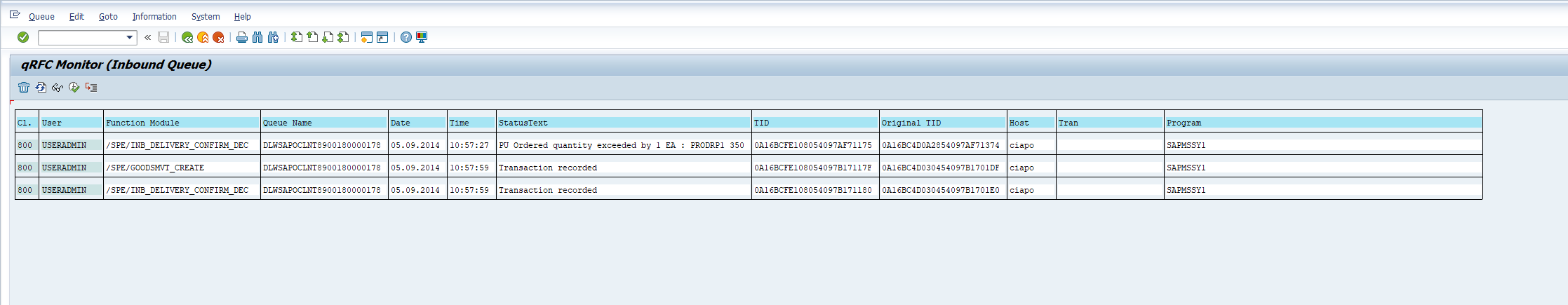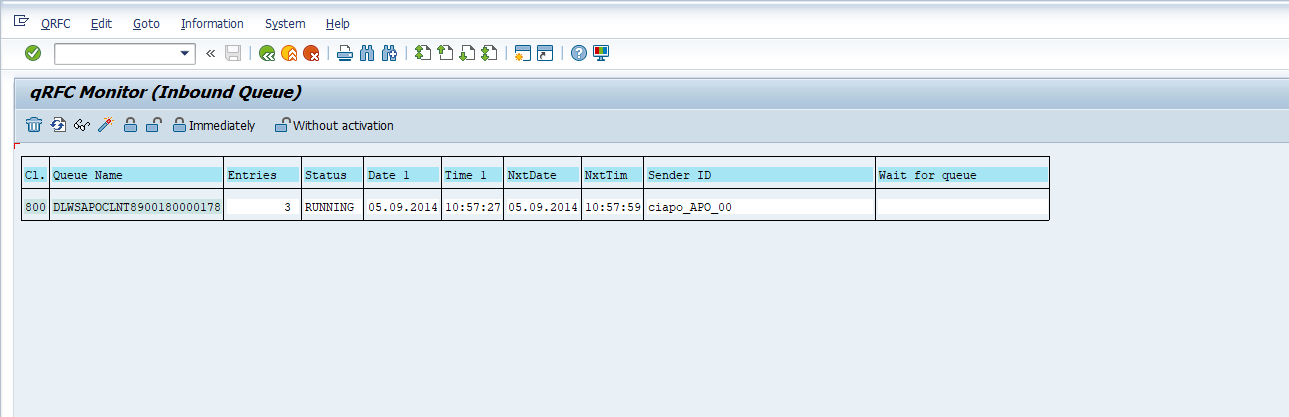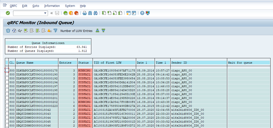 You will now be able to see when the qRFC failure was created, the sender, and the number of entries. Double-click on the qRFC name to proceed to the next screen.