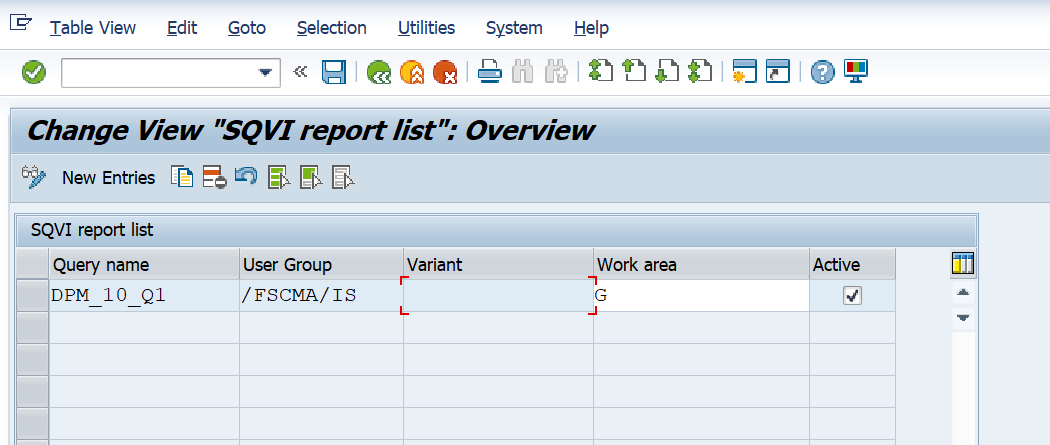 Once in SQVI report filter select the “New Entries” button. Then place the string value for the information that you would like to collect the data for. Please note that wildcards are accepted. Then select the checkbox under the column Active to enable the filter that meet your desired criteria: