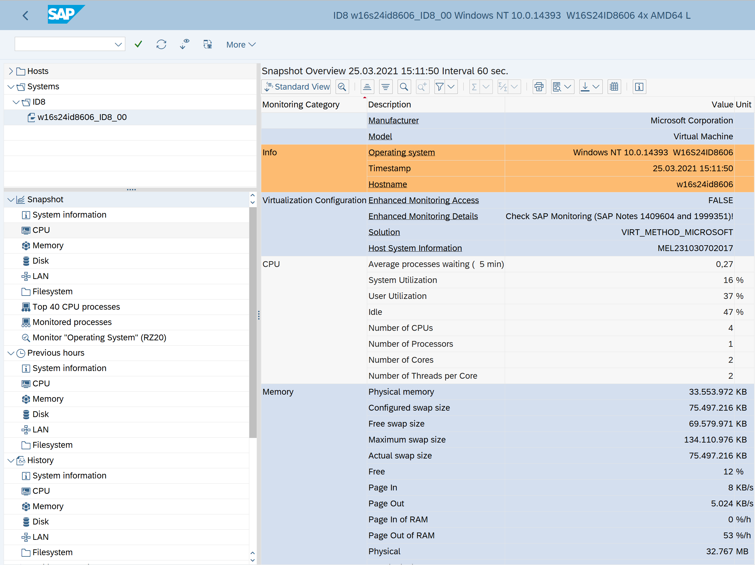 The ST06 transaction is used to display information from the OS (via the SAPHostAgent) about it’s resources including CPU, RAM, Disk & Network.