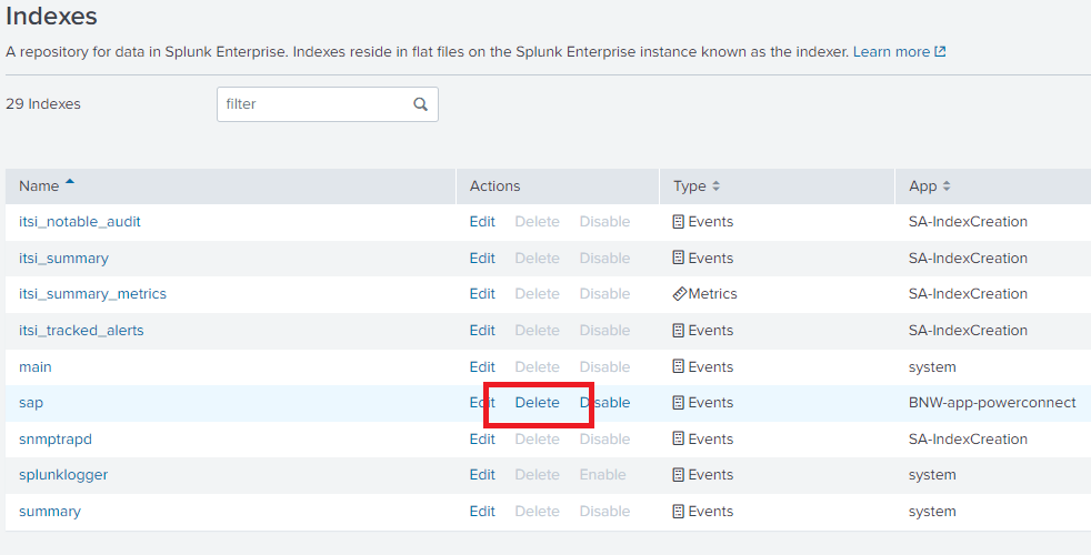 Find the index associated with the PowerConnect (typically “sap”) and click “Delete”