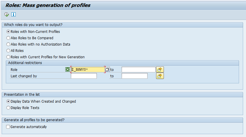 Restrict the role name to Z_BNWVS*. So it will generate every role fulfilling this pattern.