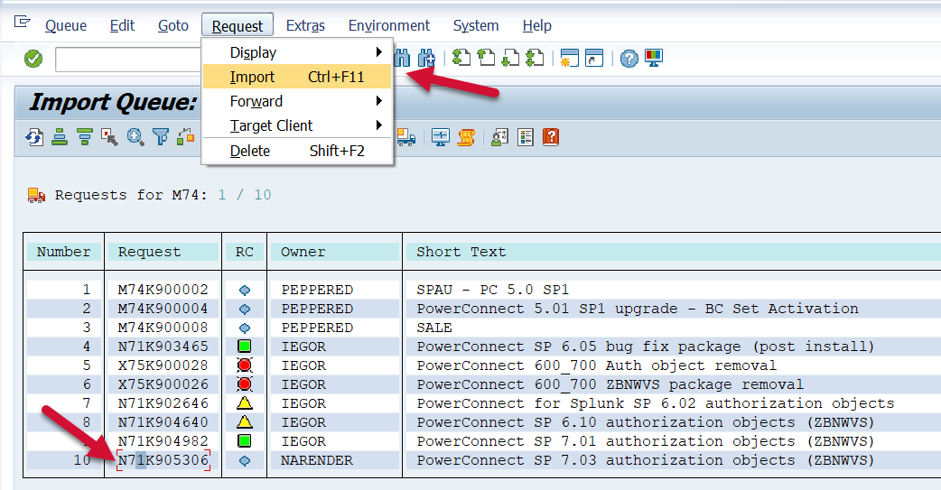 Finally select the transport and import it by navigating to menu item ”Request → Import”.